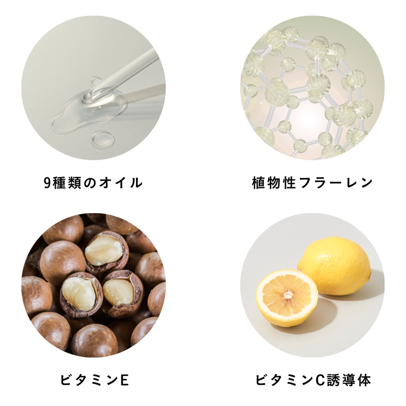 9種類のオイル…ホホバ種子油、ヘーゼルナッツ油、ゴマ種子油、スクレロカリアビレア種子油、バオバブ種子油、マカデミア種子油、月見草油、ザクロ種子油、ピスタチオ種子油