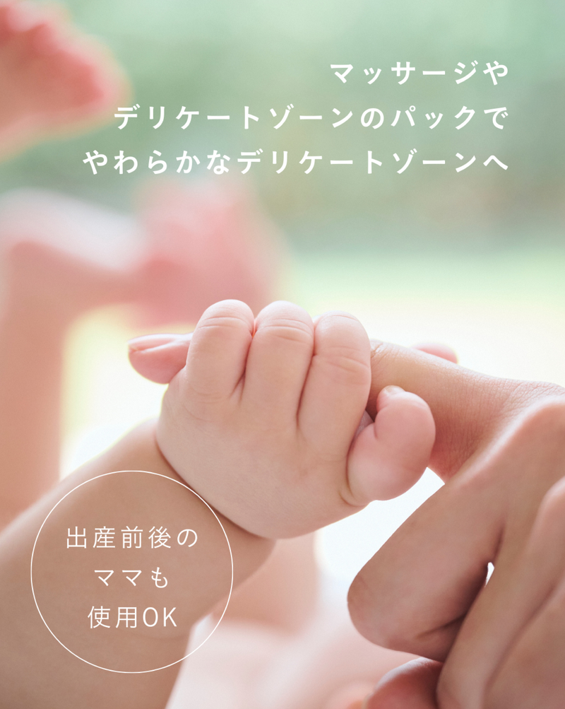 妊娠線予防や、出産前のマッサージにも。 マッサージ方法:お風呂上がりの清潔なデリケートゾーンの肌に、Uの字で塗布します。その後、会陰部分(膣口と肛門の間)にクルクルと円を描くようにマッサージします。また、コットンにオイルを含ませ、ナプキンやおりものシートの上に載せてパックをするのもおすすめです。
