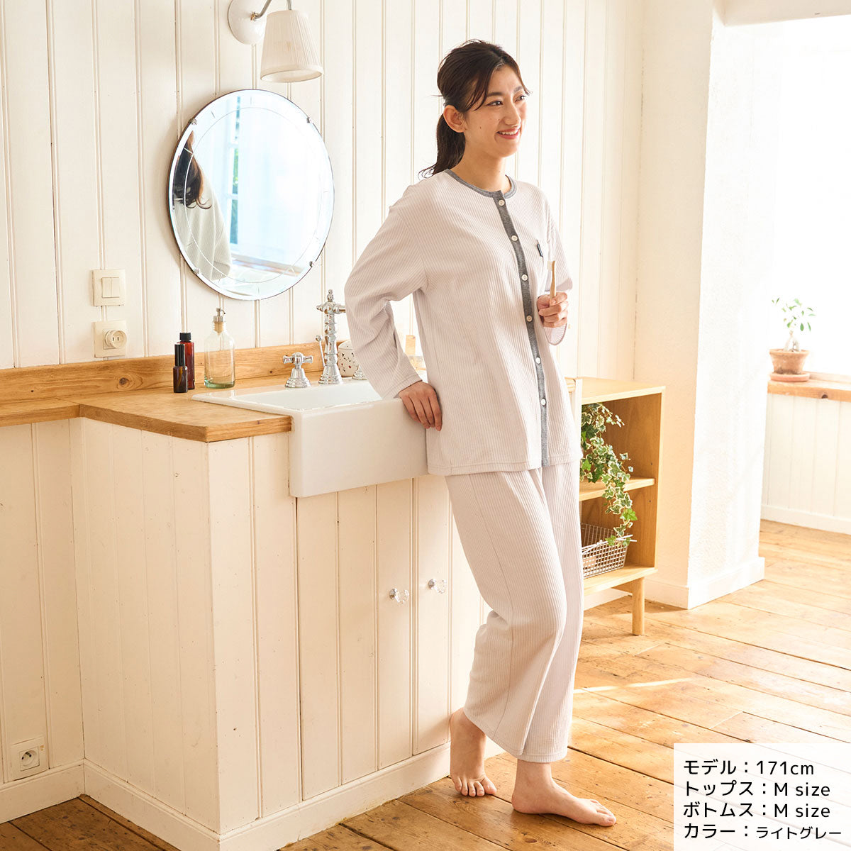 首周り、前立てのコットンコーマフライスで配色を施すことで、着ていてうれしくなるデザイン性も追求しました。また、唯一のホールド箇所となるウエストには、やさしい伸縮性のパジャマ専用ニットゴムを採用。締め付けすぎず、通気性・温湿度調整のしやすさもあるニットゴムで、細部からも衣服内環境に配慮しています。