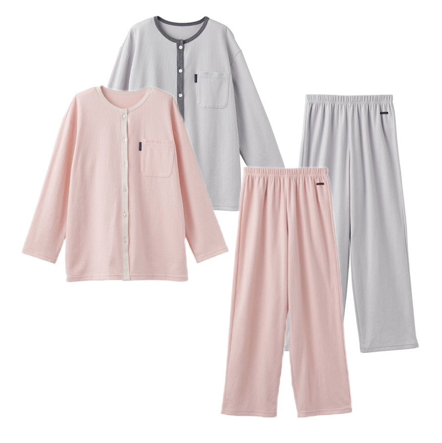 人は就寝時に”1日20回前後の寝返りを打つ”といわれていることから、身体の動きを妨げないようゆったりとしたシルエットに。首回り・前立てには伸縮性に富んだやわらかな肌触りのコットンコーマフライスを採用。配色を組むことでアクセントを作り、上下のコントラストにメリハリを付けたデザインに仕上げました。
